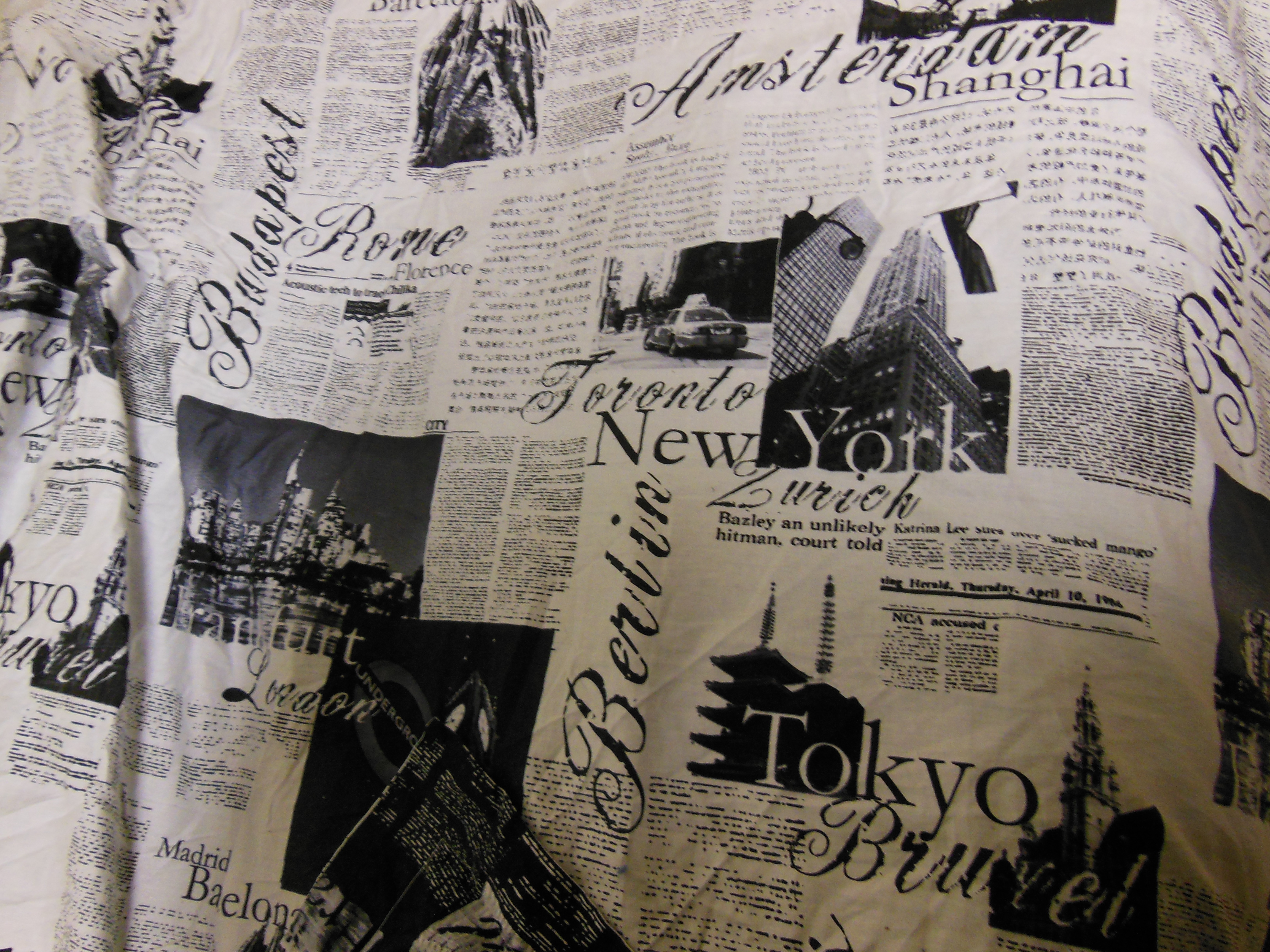I’m a big fan of my bedding set. It looks like newsprint, and it’s reversible. Plus, there’s matching pillow shams! I really, really love this bedding.