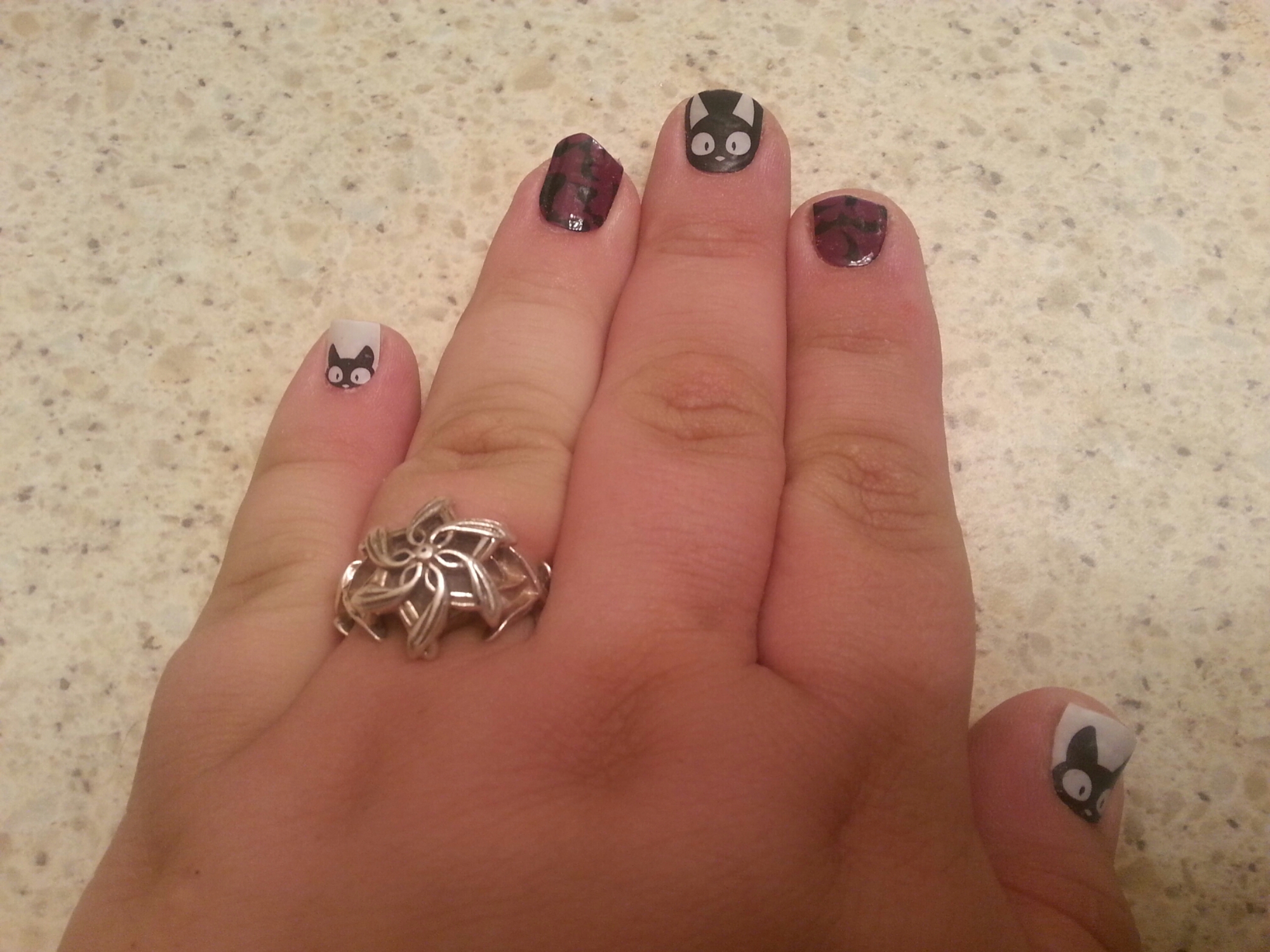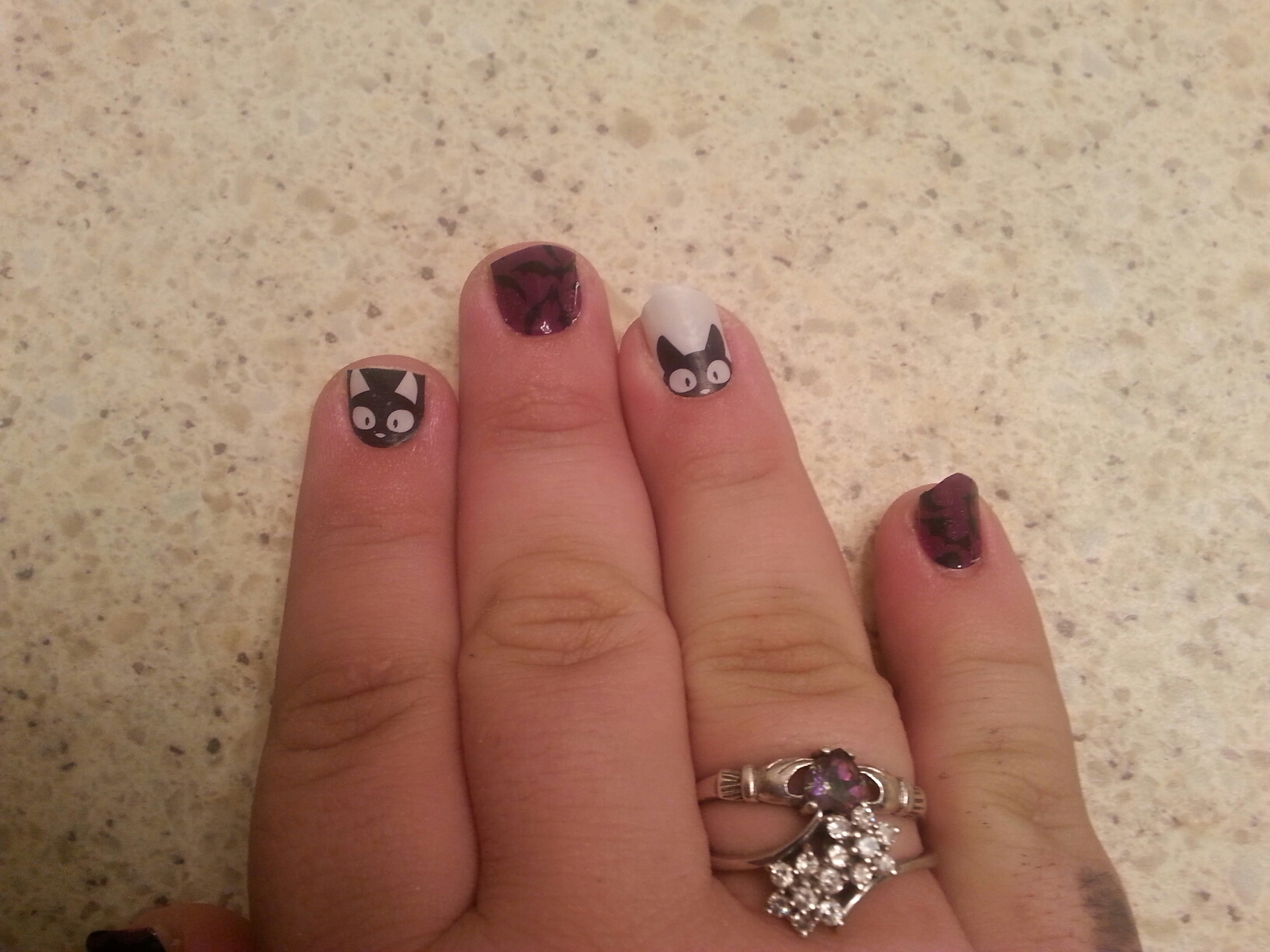 A little late in the day, but I just finished my weekly jamicure. I’m loving the new cat wrap (Double Trouble), it goes perfect with my purple bat wrap (it’s now a retired wrap. A fact which makes me sad).