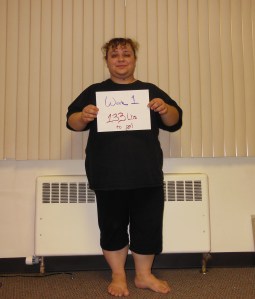 A requirement I’m making of myself for this whole accountability thing, is posting pictures of my progress.  I think this is important, because I’m really camera shy.  I’m usually the one volunteering to take photos, because I don’t want to see myself.  This is a sad state of affairs.  I have few recorded images of myself with my friends.  I need to get over this, and what better way than sharing my journey/struggle with the public.  The photos below mark the beginning of my first week back of exercising, and how far I have to go.